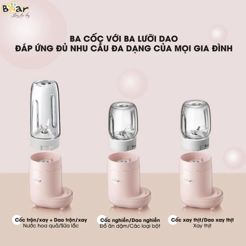 Máy xay ăn dặm 3 cối Bear LLJ-C04J1 (GR-B03V1) chính hãng với thiết kế thông minh tích hợp đến 3 loại cối và lưỡi xay khác nhau cùng công suất 200W cho phép bạn xay nhiều loại thực phẩm khác nhau như: rau củ, thịt, cá, cháo,… cho bé tiện lợi mỗi ngày. Cùng BearVietnam trải nghiệm ngay phiên bản máy xay 3 cối Bear LLJ-C04J1 (GR-B03V1) ngay nhé.